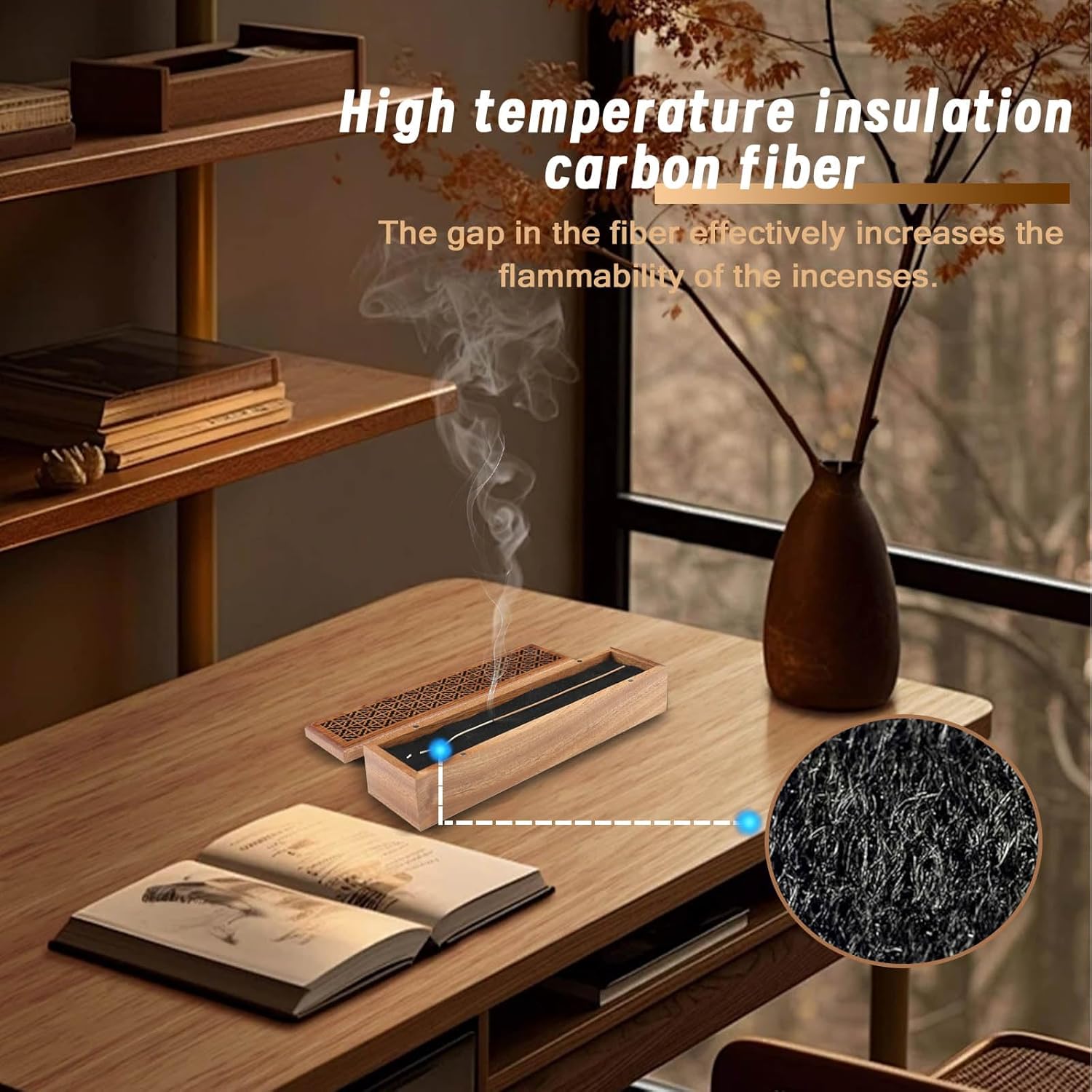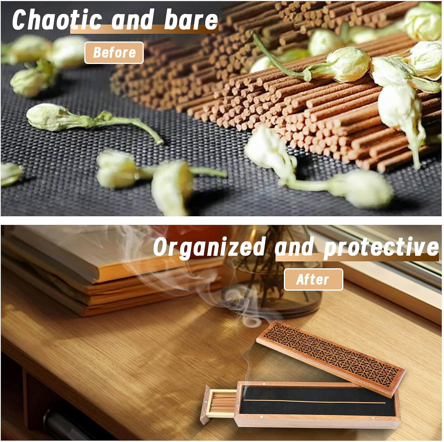 - [Exquisite & Premium Material]: This incense holder base is made of natural wood, beautiful and sturdy. The elegant, hollow pattern design adds classical beauty to this incense burner. When you light the incense sticks, the scent and smoke will slowly rise from inside the box.